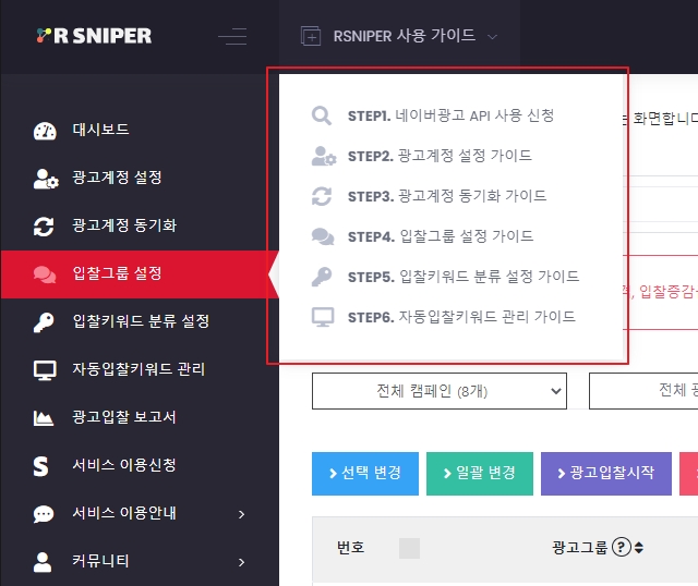 1. 최상단 로고 우측 [RSNIPER 사용 가이드]를 클릭하시면 팝업이 생성됩니다.